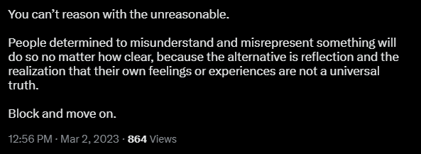 Every single time a bunch of his patrons leave or are booted, there’s a wild flurry of announcements or speeches where he claims that the people who are gone simply didn’t respect his boundaries. Sex work is always brought up, the implication being that those who have left are puritans who have no respect for those in the sex work industry. Jealousy is raised. The idea that we wanted something from him that we were not entitled to. The self deprecation is laid on thick. He’s just a regular guy, and not even a good one. A really shit one, in fact. Has never claimed otherwise. He’s just trying to do good. To be better.