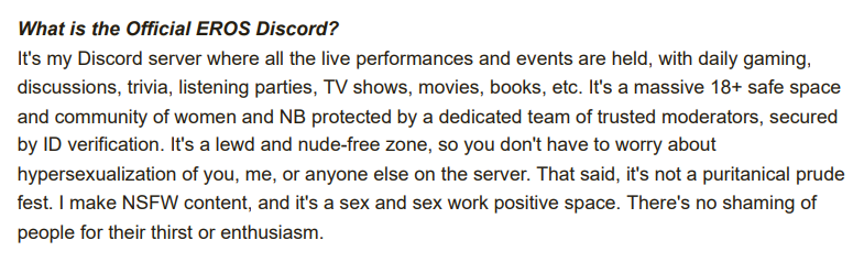 The reason I posted this excerpt is to show you how the discord was promoted to prospective patrons back when I joined. The discord was advertised as a “safe space and community of women and NB protected by a dedicated team of trusted moderators”. A little further on it states that it is a “lewd and nude-free zone, so you don’t have to worry about hypersexualization of you, me, or anyone else on the server”. This is how the discord was advertised the entire time I was a member. I want you to bear this in mind while you read this post.
